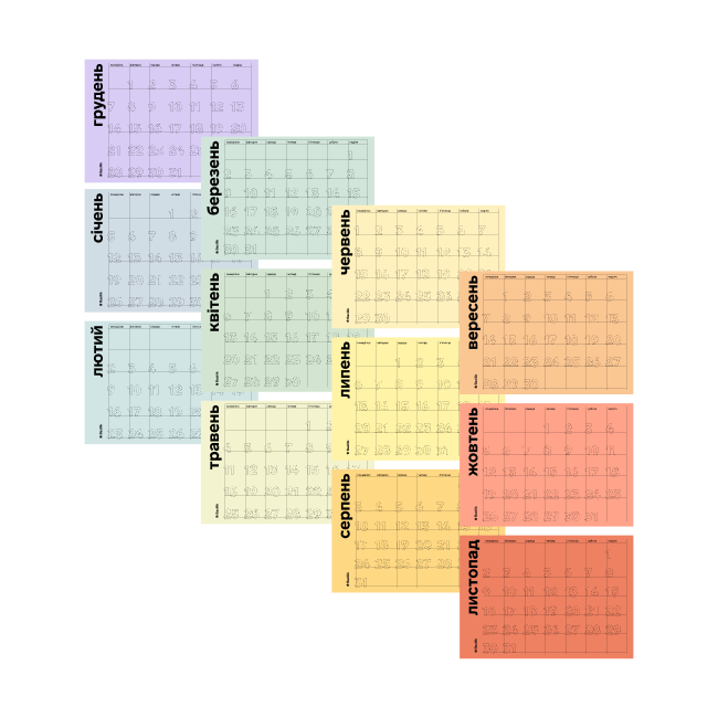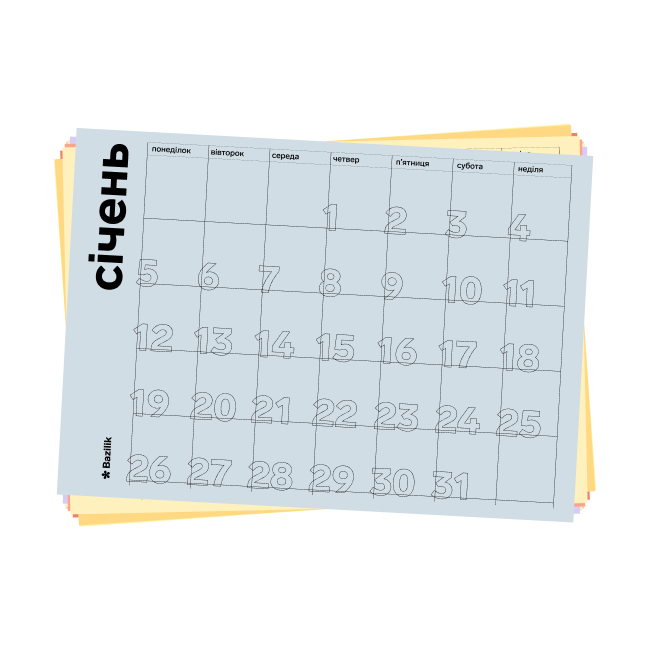 Календар на 2026 рік, де кожен місяць — окремий аркуш. Формат А5 ідеальний для оформлення робочого столу — змінюй аркуш щомісяця і зберігай пройдені місяці для особистого звіту наприкінці року.